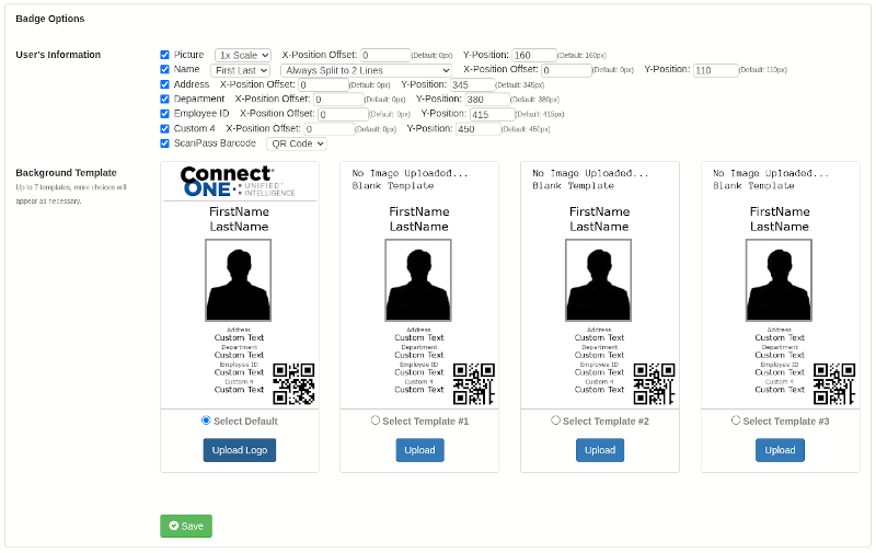There are up to 7 custom templates, the customized options including a background overlay, what fields to print, the scale of the image, and where to position the image and text. These templates can be printed directly from Connect ONE to a local badge printer. A custom logo can be uploaded for the default template. A barcode can be added for scanning within the Connect ONE App by security personnel for user verification.