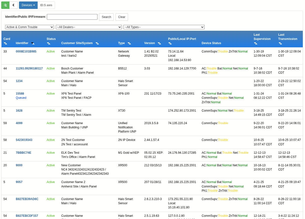 - Device Status: A new unified screen now displays the status of all devices across all customer accounts in one place. Advanced filtering allows you to quickly isolate issues by specific trouble types or manufacturer type.